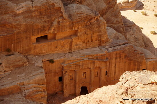 Von hier oben sieht man etliche Zisternen, die Nutzung des Gebäudes könnte natürlich auch damit zu tun haben. Damals wie heute regnet es in dieser Gegend selten. Ist es dann aber mal so weit, kommt das Wasser in Massen. Durch die zahlreichen Zisternen, Kanäle und Wassertunnel wurde Petra nicht nur vor diesen Wassermassen geschützt. Vielmehr machten diese Wasserspeicher damals ein Leben für diese große Zahl an Menschen überhaupt erst möglich. Zu seiner Blütezeit im 2. Jahrhundert vor Christus hatte Petra immerhin rund 30.000 Einwohner.