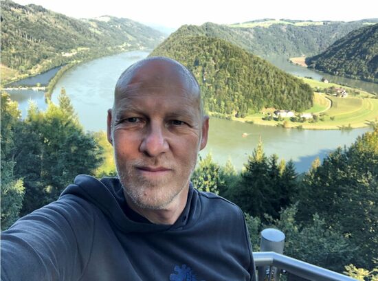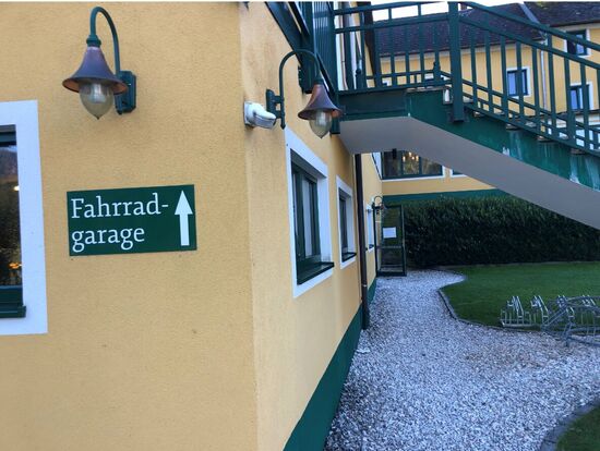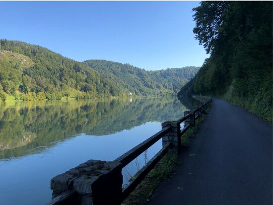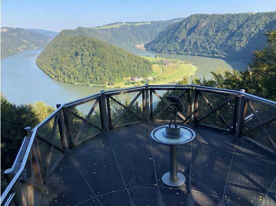 Nach ein paar Kilometern kam ich nach Schlögen. Hier war die berühmte Donauschleife. In meiner Radkarte war ein Aussichtspunkt auf einem Berg mit "Schlögener Blick" gekennzeichnet. Am Hotel Donauschlinge fragte ich einen Mitarbeiter der draußen stand, ob sich der Aufstieg lohne. Er sagte "auf jeden Fall". Er bot mir an, mein Rad in die Garage des Hotels abzustellen. Super, wie cool. Ich freute mich total und machte mich auf die 200 m hohen Aussicht.