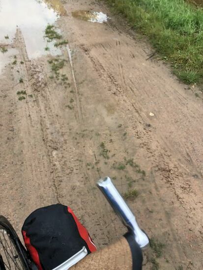 Nachts hatte es ordentlich geregnet. Aber morgens um 6:00 Uhr war es trocken. Nachdem ich mich gewaschen hatte, stand ich noch ein wenig mit einer Frau am Waschhaus. Sie fragte mich, wo es denn hin geht mit dem Rad. Es ist tatsächlich mal ganz schön, wenn man sich morgens ein wenig unterhalten kann.