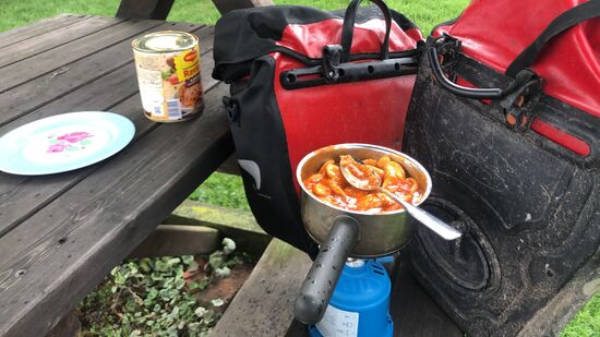 Nach dem Duschen im Sanitärcontainer kümmerte ich mich ums Essen. Super, dass ich die Dose Nudeln aus dem Supermarkt mitgenommen hatte, denn hier auf dem Campingplatz gab es nichts. Ein kleiner Imbisstand hatte zu.