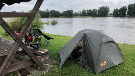 In Westerhüsen kam ich dann an die Elbe. Etwas weiter kam ich dann nach 116 km auf dem Campingplatz "Magdeburg" in Schönebeck an. Der Campingplatz lag auf einer Landzunge in einem Hafengelände. Dieser Platz war sehr schlicht und spartanisch ausgestattet und wirkte zunächst einmal auf mich recht speziell. Mein Zeltplatz direkt an der Elbe war echt top. Ich stellte mein Zelt direkt neben einer überdachten Holztischkonstruktion auf.