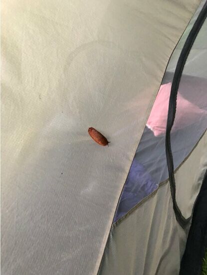 Morgens wachte ich wieder recht früh auf. An meinem Zelt hingen ein paar Nacktschnecken. Zum Glück von außen.