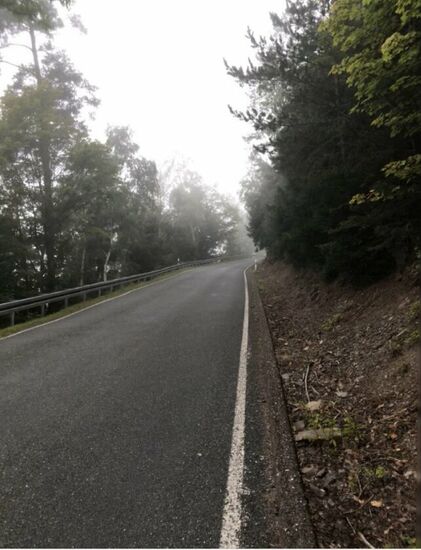 Es ging morgens gleich in die vollen. Die ersten km führten bergaufwärts durch Wälder. Autos waren komischerweise so früh noch nicht unterwegs. Trotzdem setzte ich meine Stirnlampe mit Vorder- und Rückleuchte auf dem Kopf, da es nebelig war.