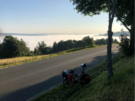 Nachdem ich,, aufgrund einer Straßensperrung einen kleineren Umweg über Feldwege fahren musste, kam ich wieder auf die Landesstrasse. Von hier aus hatte ich irgendwann einen Blick auf das, mit Nebel gefüllte, Saaletal. Ein unglaublich schöner Blick.
