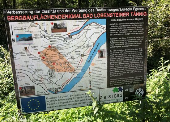 Nach dem Waldabschnitt kam ich, über eine verlassene Bergbauflächenregion, wieder auf eine Straße. Durch ein Schild war gekennzeichnet, dass ich mich hier gerade auf einer Fernradroute, der "Euregio Egrensis" befand, welche Tschechien mit den Bundesländern Sachsen, Thüringen und Bayern verbindet.