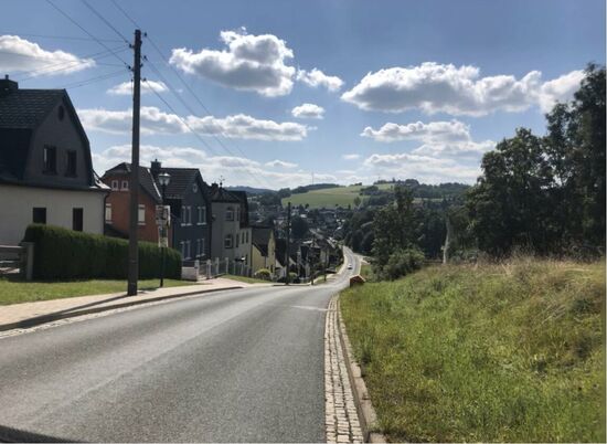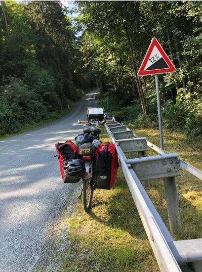 Ich fuhr nun wieder recht nah an der Saale entlang. Die Gegend war bei Sonnenschein echt super schön. Dann kam vor Harra wieder ein Anstieg der sich sehen lassen konnte. Satte 12 %. Mit meinem Radgepäck war das schon schiebenderweise eine Qual und fraß eine Menge an Kalorien.