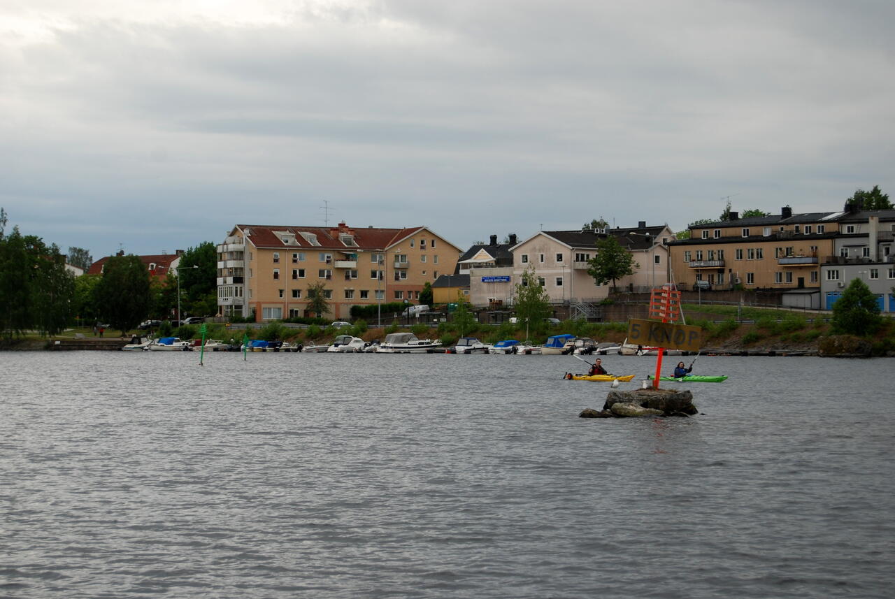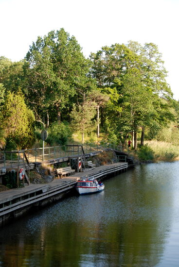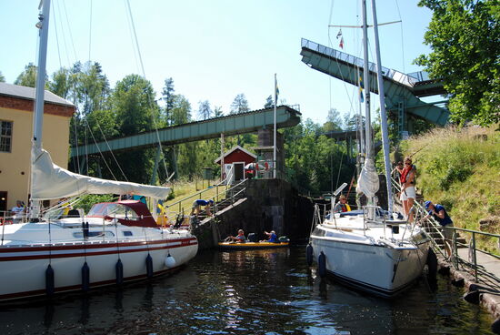 Nur noch eine Schleuse trennte uns dann noch von dem Verkehrsknoten Håverud. Hier kreuzen sich Straße, Eisenbahn und der Wasserweg des Dalsland-Kanals. Dies wurde aber erst möglich, als der Wasserfall durch den von Nils Ericson konstruierten Aquädukt überbrückt werden konnte. Dies ist eine bekannte Sehenswürdigkeit, wo sich auch viele Touristen versammelten. Bevor wir mit zwei Segelbooten durchgeschleust wurden, mußten wir ca. eine Stunde auf das Touristenboot warten. Nach zwei weiteren Schleusen erreichten wir die letzte vor dem Vänern, Köpmannebro. An der Schleuse dort aßen wir erst einmal ein großes Eis. Der Schleusenwärter sagte uns, daß man diese auch durch einen kleinen Flußlauf umfahren kann. So fuhren wir bis zum Vänern, wo uns aber ein sehr reger Bootsverkehr abschreckte. Deshalb kehrten wir um und übernachteten im Gästehafen an der Schleuse von Köpmannebro.