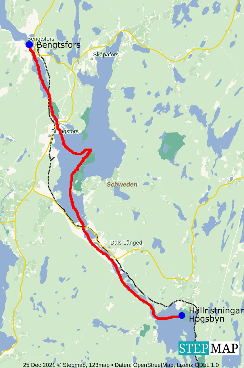 Wir fuhren mit dem Boot auf dem Anhänger nach Årjäng, wo wir seesetzten. Nach einer Übernachtung im Gästehafen fuhren wir in Richtung Süden. Gleich auf der ersten Insel sahen wir einen Elch am Ufer. An der Schleuse von Gustavsfors sahen wir viele Kanadier, die auf Vermietung warteten. Wir fuhren weiter nach Bengtsfors, wo wir übernachteten.