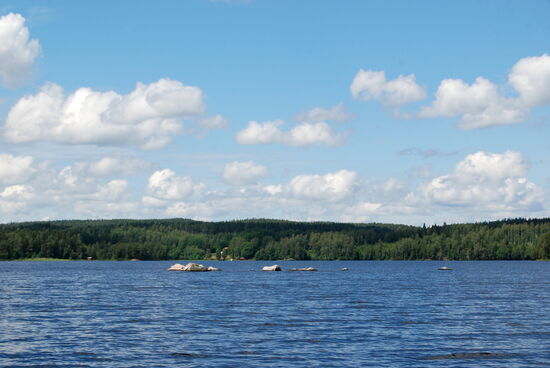 Insel Bondholmen im See Råvarp, im Hintergrund Högsby mit den Felsritzungen