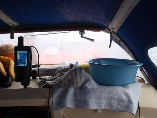 Am nächsten Morgen beim Frühstück fing es dann an zu regnen, wie vom Wetterdienst versprochen. So verzichteten wir auf eine weitere Erkundung der Umgebung und fuhren den direkten Weg zurück zur Schleuse. Bei geschlossener Kapell, durch die es teilweise tropfte, hatten wir nur einen undeutlichen Blick. Das GPS-Gerät half uns, den richtigen Fahrweg zu finden. Kurz vor der Schleuse kam uns ein Pulk Kanadierfahrer entgegen. Die Armen, bei dem Regen!