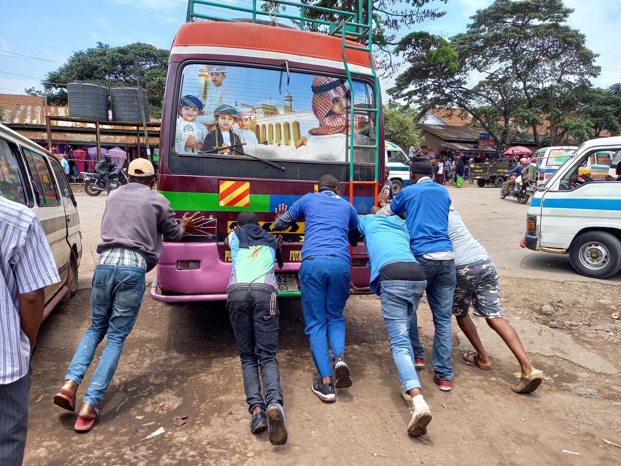 Psteen und ich machen uns auf dem Weg zum Großmarkt. Ida und Leah sind weiter auf dem Markt unterwegs. Doch wir kommen zunächst nicht weit - ein Bus war liegengeblieben und da springt Psteen sofort dazu und schiebt mit an.