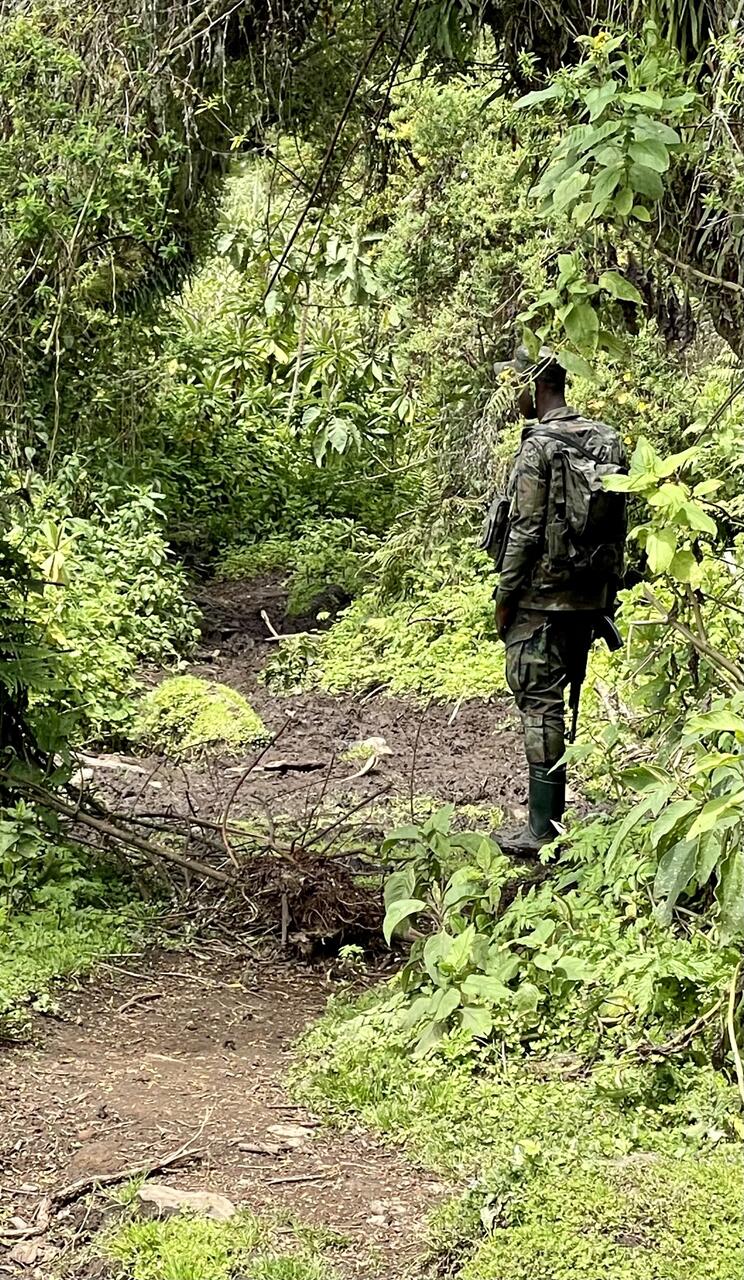 Nach ca. 2 km treffen wir auf eine Gruppe Soldaten. Diese haben auf uns gewartet. Vier bewaffnete Soldaten werden uns heute begleiten. Wir betreten jetzt den Nationalpark, in dem auch eine Vielzahl wilder Tiere leben: Elefanten, Buffalos, etc. - vor diesen sollen uns die Soldaten beschützen. Wir bewegen uns aber auch unmittelbar (ca. 1-2 km) von der Grenze zum Kongo entfernt. Die Sicherheit der Besucher ist dem Nationalpark und der Regierung sehr wichtig. Aus dem Kongo sind schon mal Rebellen und Wilderer in dieses Gebiet gekommen. Unsere Eskorte soll uns beschützen.