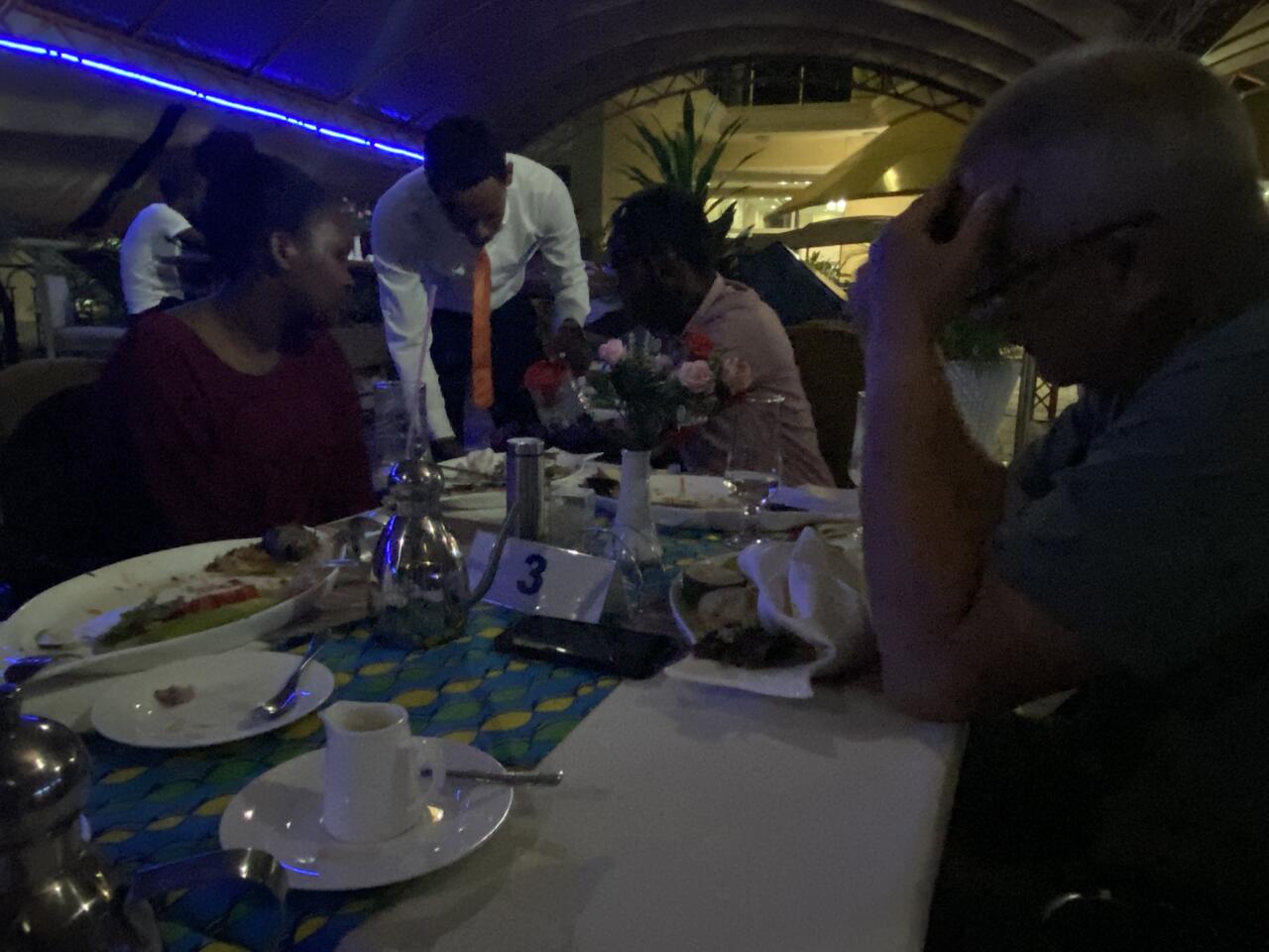 Wir treffen uns in einen guten Stadthotel mit Live-Musik und essen „Makeke“ das ist der Fisch hier aus dem Tanganyke-See—vorher gibt es wieder die Händewaschen-Prozedur