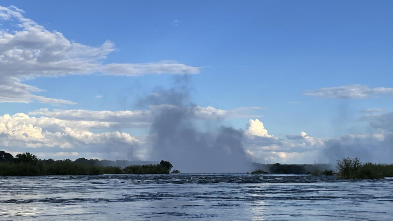 An dieser Stelle geht es 110 Meter tief. Und dass das viele Wasser so tief stürzt und die Schlucht des Sambesi unten nur 50 Meter weit ist, entsteht eine unglaubliche Gischt, die hunderte Meter hoch ist und auch hunderte Meter entfernt auf der Brücke noch spürbar ist.