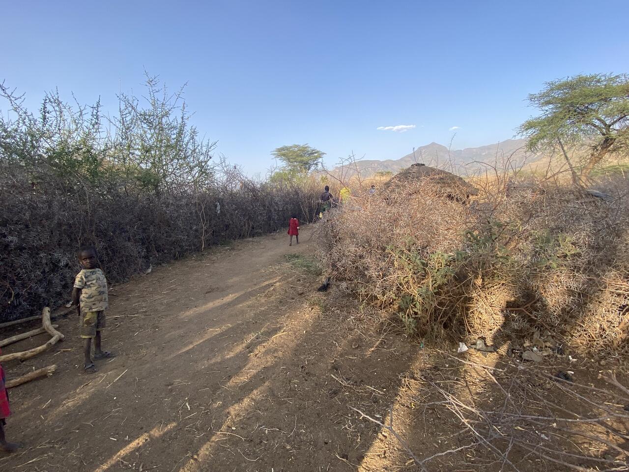Hier stehen wir vor einem Zaun, der die Hütte(n) seiner Bewohner umkreist. Die Zäune sind aus Dornenbuschsträuchern oder -bäumen und soll Eindringlinge abhalten. Der Durchgang im Zaun ist niedrig, er wird von innen dann mit einem Dornenstrauch geschlossen, der von Außen nicht entfernt werden kann. So sind die Bewohner sicher. Auch die Kleintiere nimmt man mit hinein, dort sind sie geschützt. Innerhalb eines solchen Kreisels lebt eine Familie. Das sind teilweise mehrere Hütten.