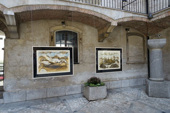 Für uns gings nach einem kurzen Trinkstopp weiter bis zum Rathaus, einem imposanten Gebäude, ursprünglich erbaut in 1484, wieder neu errichtet in 1718 nach Plänen des Architekten Gregor Maček. Im Inneren 2 Ausstellungen, die des Fotografen Matej Povše, der grosse Schwarzweissfotos seiner Eindrücke vom kürzlichen Besuch in der Ukraine ausgestellt hat, und Werke des Malers Admir Ganić.