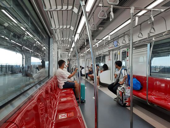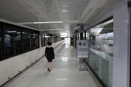 In Don Muang musste ich erst einmal durch den ganzen Flughafen laufen. Nachdem das einmal das Drehkreuz für Südostasien war, kommt also eine ganz schöne Strecke zusammen. Heute werden Flughafen kompakter mit kürzeren Laufwegen konzipiert. Am Kofferband angekommen startet mein Koffer gerade die zweite Runde. Das habe ich auch noch nie erlebt. Der zweite Flug, bei dem mein Koffer vor mir an der Gepäckausgabe ist und das wohlgemerkt ohne, dass ich durch eine Grenz- oder sonstige Kontrolle hätte durch müssen. Also den Koffer geschnappt, raus in die Ankunftshalle und dabei die „Taxi“ Rufe ignoriert. Auch hier nirgends eine Covid Kontrolle. Dafür gleich gut sichtbar der Wegweiser zur SRT Red Line, der neuen Zugverbindung vom Don Muang zum neuen Hauptbahnhof Bangkok, dem Bang Sue. Es gibt zwar noch Proteste der Pendler, die täglich zum alten Hauptbahnhof fahren, aber geplant ist im Prinzip, den alten Bahnhof mehr oder weniger stillzulegen, weil man damit 29 größere Kreuzungen in Bangkok vom Verkehr entlasten will. So habe ich das zumindest irgendwo gelesen. Das Schöne an der Fahrt ist wieder, dass man auf Stelzen fährt und so einen tollen Blick hat. An manchen Stellen sieht man alte Stützen, die vor etlichen Jahren bereits gebaut worden sind und vor sich hingammeln. Ich gehe davon aus, dass der ursprüngliche Plan, auch den Don Muang über eine Hochbahnlinie an die Stadt anzubinden sich durch die neuen Planungen, den Hauptbahnhof aus der Stadt rauszuverlagern und eine Hochgeschwindigkeitsstrecke nach Chiang Mai zu bauen überholt worden ist. Die Fahrkarte kostet für die etwa 15 minütige Fahrt 37 B und diese Bahn endet hier.