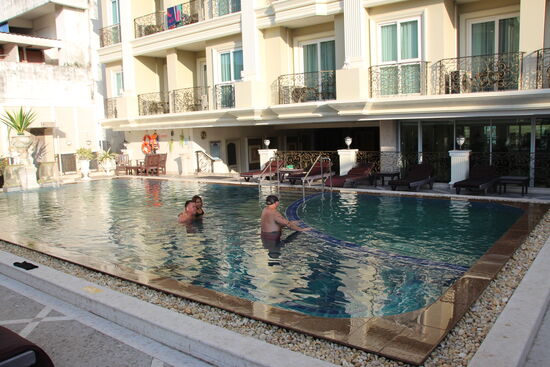 Das ganze Hotel wie auch das Zimmer sollen wohl italienischen Stil darstellen, wie Thais sich das so vorstellen. Herausgekommen ist vor allem in der Lobby ein unglaublicher Kitsch. Trotzdem gefällt es mir hier ganz gut. Nachdem ich ausgepackt habe, bin ich erst einmal auf die Suche nach dem Pool, der sich im dritten Stock befindet. Mein Zimmer befindet sich im zweiten (hintern) Gebäude, im 9., dem höchsten Stock. Von hier über den Aufzug komme ich gut zum Pool. Deshalb wird der auch gleich mal getestet. Es fehlen Handtücher, aber die hat gerade jemand geordert. Als Nachschub da ist teste ich das Wasser. Hier ist es wieder deutlich angenehmer als in Chiang Mai. Auch die Liegen sind recht bequem.