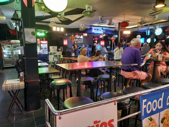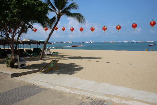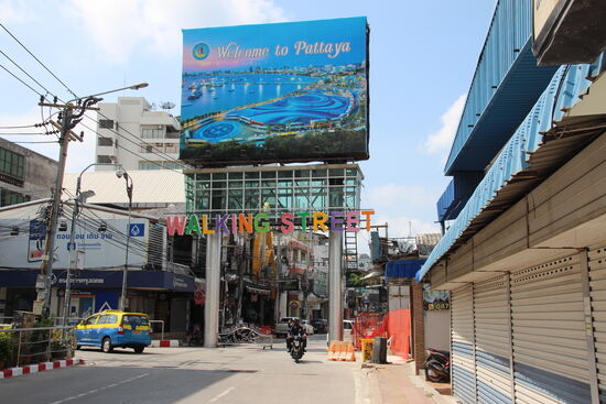 Nach dem Frühstück mache ich mich auf zu einem ersten Rundgang. Ich laufe am Strand entlang, der richtig leer ist, bis zur Walking Street. Hier mache ich ein Foto von der ziemlich trostlos aussehenden Straße. Auch früher hat die Straße tagsüber eher still gewirkt. Heute kommt dazu dass viele Gebäude und auch die Straße wie Baustellen aussehen. Da spricht mich einer an, was ich fotografiere. Ich erzähle ihm, dass ich die Straße aus vor Corona Zeiten kenne und das Bild leicht deprimierende finde. Er bestätigt das und meint, bis in einem Jahr sieht es hier wieder anders aus.