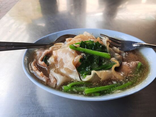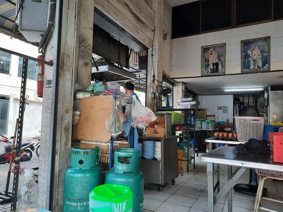 So langsam könnte ich etwas zu essen vertragen. Ich komme durch eine Gasse mit verschiedenen Garküchen. Am Ende der Gasse fällt ein Ecklokal auf, in dem alle Tische belegt sind. Um die Ecke ist aber noch einer frei. Ich bestelle Suppe, das einzige Essen, das es hier anscheinend gibt und für das sich die Leute hier auch anstellen. Es ist etwas gelierte Brühe mit viel breiten Nudeln, Fleisch und etwas Grünzeug. Sie schmeckt mild, leicht süßlich und lecker. Während ich esse, kommen viele Thais, die sich die Suppe „to go“ in Plastiktüten mitgeben lassen.