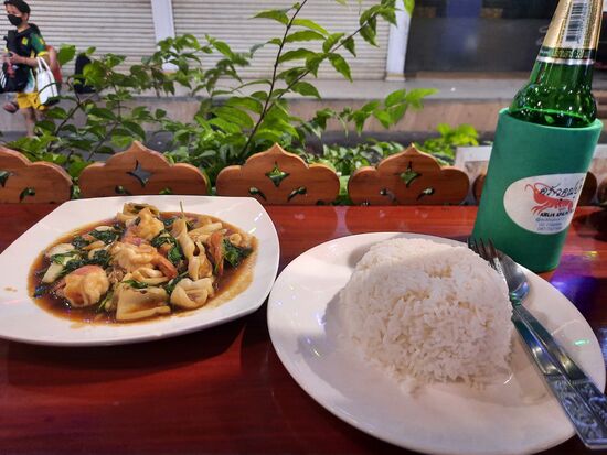 Zu Abend esse ich heute in einem neuen Lokal an der Ecke zur Soi 8, dem Krua Khun Puk, dass im Internet gelobt wird. Die gebratenen Meeresfrüchte mit Thaibasilikum sind auch wieder recht mild aber aromatisch lecker. Die Portion könnte etwas größer sein, aber mit Reis dazu ist in Ordnung und für 120 B + 20 für den Reis auch preislich für die Lage gut. Das kleine Chang kostet 100 B scheint eine Art Standardpreis zu sein.