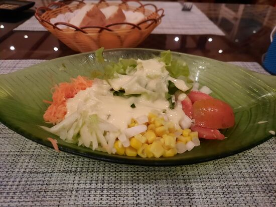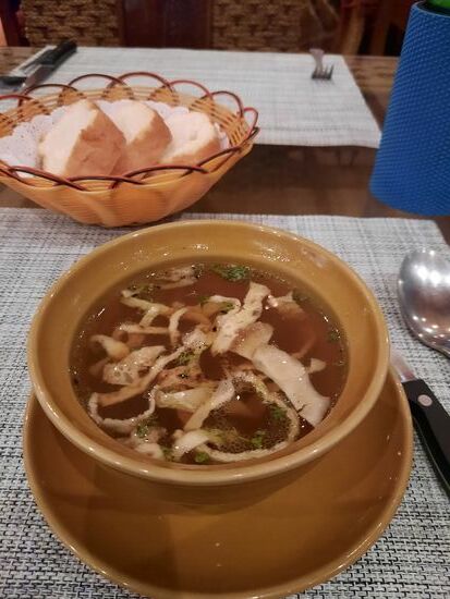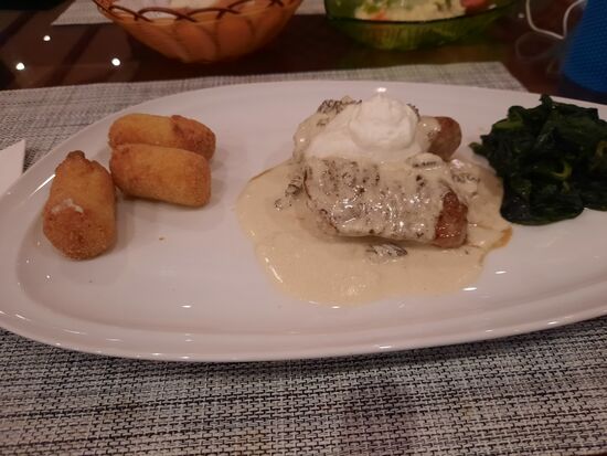 Zum Abendessen möchte ich heute in das Pfälzer Restaurant. Nachdem es inzwischen nicht mehr regnet und noch etwas früh ist, laufe ich einen kleinen Umweg und komme dabei am Swiss Chalet vorbei. Wie ich das Schild in einer Seitengasse so im Vorbeilaufen sehe, kommt mir die Erinnerung, dass ich hier bei meinem letzten Aufenthalt in Pattaya auch schon einmal zu Essen war. Vor der Pfälzer Stube bleibe ich unschlüssig stehen. Er wirkt recht leer. Spontan drehe ich um und gehe zu Swiss. Da ist es dann auch nicht voller. Egal. Jetzt esse ich hier. Ich nehme eine Flädlesuppe die es heute als Tagessuppe gibt. Dann Schweinefilet mit Morchel Rahm, Croquetten und Spinat. Die Bedienung sagt mir, dass bei dem Essen eine Suppe und ein Salat dabei sind. So zahle ich für die Suppe, einen gemischten Salat und das leckere Schweinefilet mit vermutlich hausgemachten Croquetten und leckerem Blattspinat 390 B. Da kann man sich auch nicht beschweren.