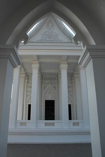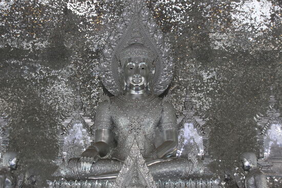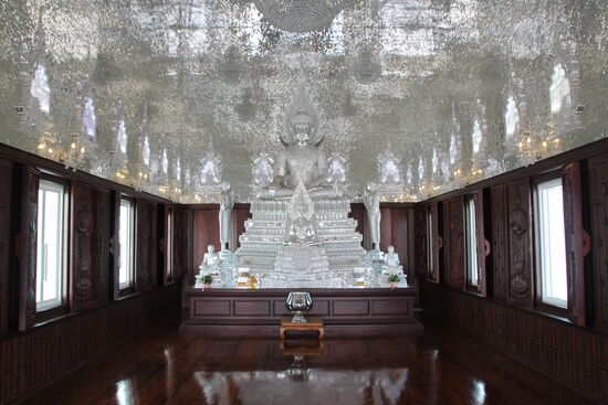 Auf Google Maps habe ich zwei Tempel etwas südlich im Landesinneren bei einem kleinen See entdeckt. Nach den eingestellten Bildern könnten die Beiden recht sehenswert sein. Beide liegen nur etwa 1,5 Kilometer auseinander. Der etwas weiter Entfernte ist der Wat Phon Prapa Nimit. Beinahe wäre ich an dem vorbeigefahren, aber man sieht ihn von der Landstraße aus. Also zurück und die nächste Gasse rein. Der Tempel ist wieder einmal schneeweiß. Ein Mönch nickt mir zu und meint, ich dürfe auch rein und innen fotografieren. Im Bot kommt dann die eigentliche Überraschung. Die Decke und die oberen Ränder der Wände sind komplett mit Glasblättchen bedeckt. Der Buddha mit allem darum herum ist komplett aus Silber. Das Silber und das Glas gehen optisch ineinander über. So etwas habe ich bisher auch noch nie gesehen.