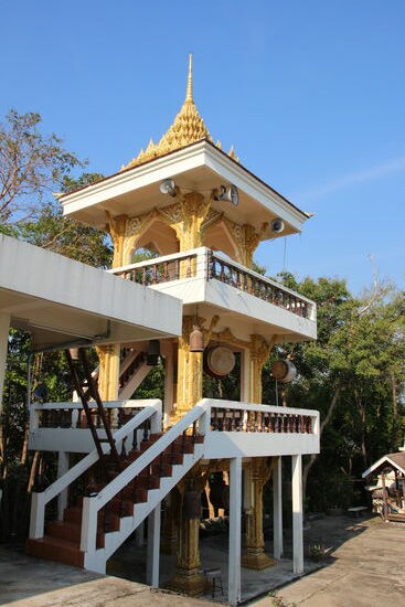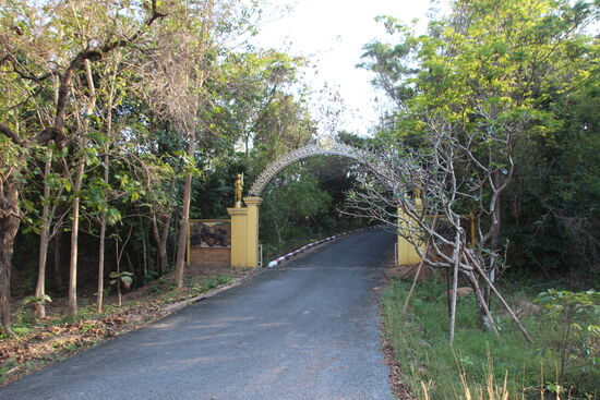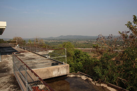 Direkt neben dem Eingang zum Tempel gibt es ein weiteres Tempeltor. Durch dieses führt ein Weg steil auf einen kleinen Hügel. Ich wäre nicht ich, wenn ich da nicht rauffahren würde. Hier oben ist alles recht verlassen. Nur ein einzelner Mann werkelt herum. Als er mich sieht, winkt er mir zu, dass ich ihm folgen soll. Über eine leicht marode Eisentreppe geht es auf ein Flachdach, das mit einem Gitter versperrt ist. Er öffnet es und meint, da hätte ich eine schöne Aussicht. Das ist auch so. Leider nicht auf dem Phon Prapa Nimit. Ansonsten scheint die Anlage etwas heruntergekommen und leer zu sein. Vielleicht ist das ja die Ursprüngliche Tempelanlage, die jetzt an den Fuß des Hügels verlagert worden ist?