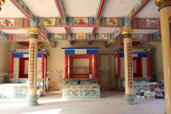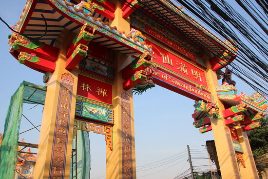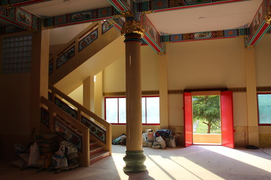 Ich bin noch nicht sehr weit gekommen, als ich an einem recht großen chinesischen Tempel vorbeikomme, der aber nur eine große Halle, ein Tor und eine Reihe von Figuren zeigt. Trotzdem wird da natürlich gehalten. Wieder ein Tempel, der gerade renoviert wird. Nachdem aber nicht versperrt ist, nutze ich die Gelegenheit und gehe trotzdem rein. Er ist innen leer. Die Wände werden gerade neu gestrichen.