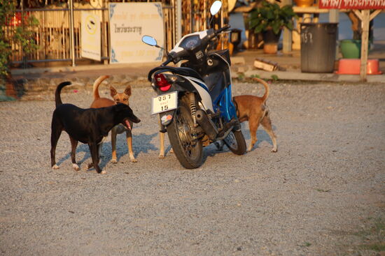 Am Wat Nong Yai habe ich das erhoffte recht schöne Licht zum Fotografieren. Allerdings ist der Bot auch hier zu. Man hört Mönche beten. Da möchte ich sowieso nicht stören. Die üblichen Tempelhunde beäugen mich auch wieder skeptisch. Die Mutigsten kommen kurz um an meiner Hand zu schnuppern, aber im übrigen halten sie auf Abstand.