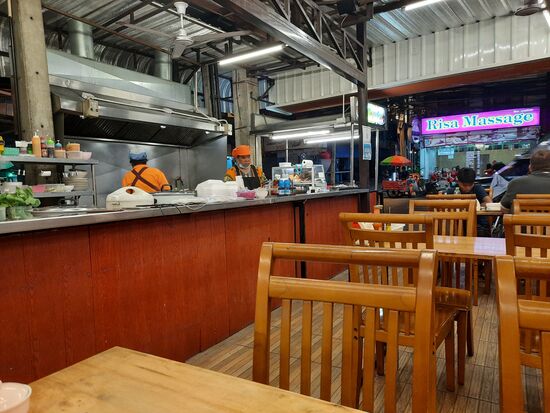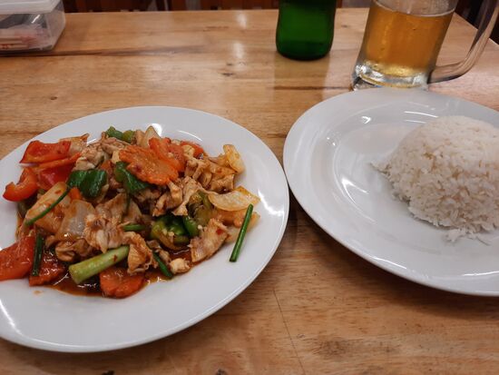 Die Entscheidung, wo ich zum Abendessen hin gehe war wieder gar nicht so einfach. Am Nachtmarkt vorbei bin ich in einer der Bierbarviertel gelandet, das für mich den Eindruck macht, als sei es noch recht neu. Hier sind die alten Standardformen und Eintönigkeiten individuellen Bars gewichen. Dementsprechend lebhaft geht es hier zu. Nur etwas Passendes zu Essen finde ich nicht. Es gibt zwar sogar einen typischen Essensnachtmarkt mir den Sitzgelegenheiten in der Mitte und Garküchen außenherum, aber irgendwie wirkt das für mich alles irgendwie nicht so ansprechend. Döner, Burger und ähnliches überwiegend. Am Ende lande ich im Little Brother, einem kleinen offenen Thairestaurant am oberen Ende der Pattaya 12 Alley, an deren unterem Ende das Empress liegt. Dort esse ich Hühnchen mit gemischtem Gemüse und Reis. Sehr schmackhaft aber auch wieder nicht scharf. Ein einfaches, leckeres Essen. Dabei fällt mir auf, dass ich erst wenig Hühnchen auf der Reise gegessen habe, wo das dich das Fleisch ist, das hier in Thailand am meisten gegessen wird.