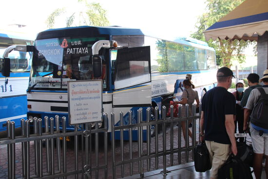 Der Wechsel nach Bangkok zurück sollte eher schneller gehen. Deshalb gönne ich mir erst noch einmal Frühstück von 10-11:00. Beim Auschecken werde ich gebeten, mich in die Lobby zu setzen und 5-10 Minuten zu warten, bis das Zimmer gecheckt ist – und das obwohl nicht einmal etwas in der Minibar war. Naja, ich habe ja Zeit. Danach frage ich nach einem Taxi zum Busbahnhof. Ich habe den Eindruck, ein Taxi zum Flughafen Bangkok zu bekommen wäre einfacher gewesen. Es stand sogar schon eines vor dem Hotel, aber das scheint auf andere Gäste zu warten, die nicht auftauchen. Nach einer Weile deutet der Hotelboy auf das und fragt „200 B?“. Zum Busbahnhof in der Nord Pattaya Road? Das ist mir zu teuer. Daraufhin deutet er zur Beach Road runter nach dem Motto „Schau da unten“. Am Eck stehen immer Motorradtaxen herum, mit dem will mich einer (mit meinem Gepäck) fahren, aber ich habe Probleme mit meinen Hüften, hinten auf dem Motorrad zu sitzen. Daraufhin hält einer der Fahrer einen Songthaew an und fragt „200 B?“. „Nein, zu teuer“. „150?“. „Also gut“. Dafür fährt der Songthaew wieder wie in Chiang Mai durch bis zum Busbahnhof, als Taxiservice eben. Um 11:15 sind wir am Busbahnhof. Der nächste Bus geht um 12:00. Check-In Zeit beim Sheraton ist sowieso ab 15:00. Also sollte das ganz gut passen. Dieses Mal bin ich mit einem der großen Busse unterwegs und der ist so ziemlich ausgebucht.