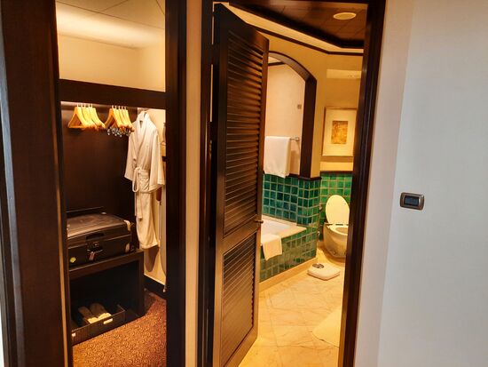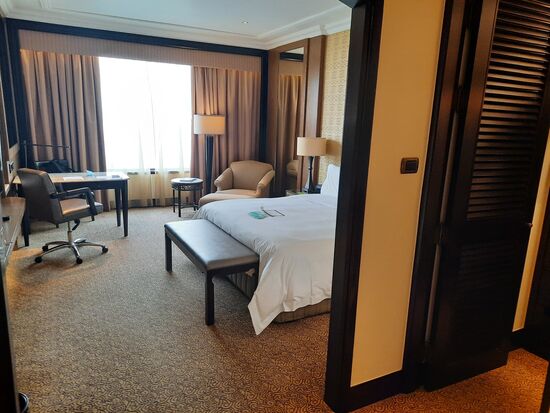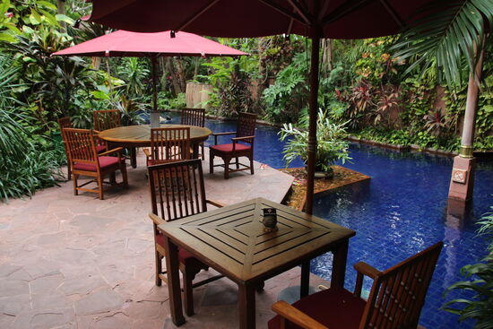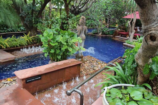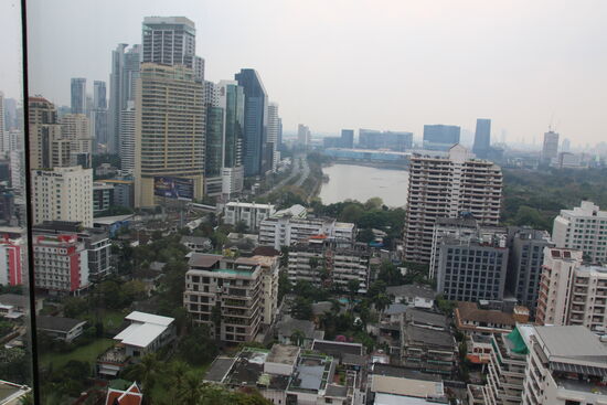 Beim Check-in zeige ich meine zwei Reservierungen. Die Anschluss Reservierung über Agoda ist bereits gezahlt. Ich muss also nur noch die ersten drei Nächte über Booking bezahlen. In der Hotelübernachtung ist bei den ersten Drei Nächten Frühstück und bei allen 4 ein Hotelguthaben von 1000 B enthalten für Verzehr im Hotel, ausgenommen die Minibar und noch ein oder zwei Bereiche. Der Rezeptionist fragt auch nach der Ausreisekarte und trägt die Abreisedaten ein. Das hatte ich bisher auch noch nie. Der Türsteher, der mich in mein Zimmer im 23. Stock begleitet macht wie üblich sämtliche Lichter an. Als er wieder gegangen ist und ich einen Teil meines Gepäcks aus gepackt habe will ich die Lichter ausmachen. Das ist soweit auch in Ordnung nur ein Indirektes Licht um den Fernseher und die Bar bekomme ich nicht ausgeschaltet. Außerdem scheint die Tür zu einem Teil der Minibar nicht zu schließen, dadurch brennt innen die ganze Zeit das Licht. Ich suche auf dem Gang den Roomservice und bitte die Dame, mir zu helfen. Den Schalter für die Beleuchtung zeigt sie mir. Bei der Tür meint sie, dass sie einen Techniker ruft und ist wieder weg. Ich mache mich auf den Weg zum Pool um ein paar Fotos zu machen. Als ich zurückkomme, ist bereits ein Techniker da und bastelt an der Tür herum. Nach einer Weile meint er, er muss etwas holen und dann noch einmal kommen. „Kein Problem, ich gehe an den Pool“: Bis ich zurückgekommen bin, war die Tür repariert.
