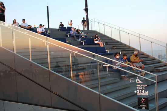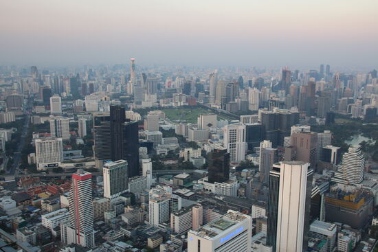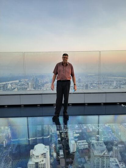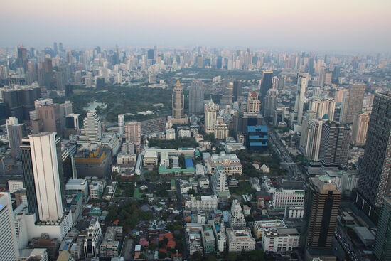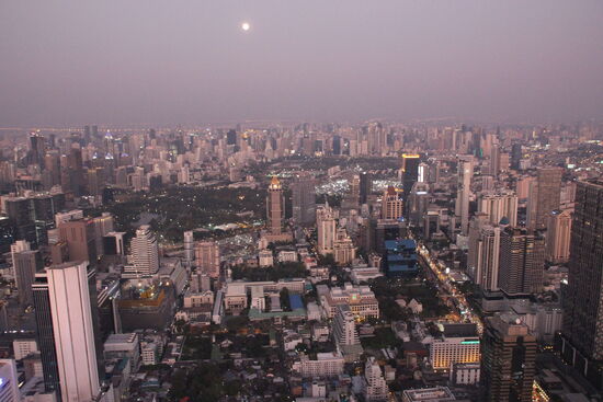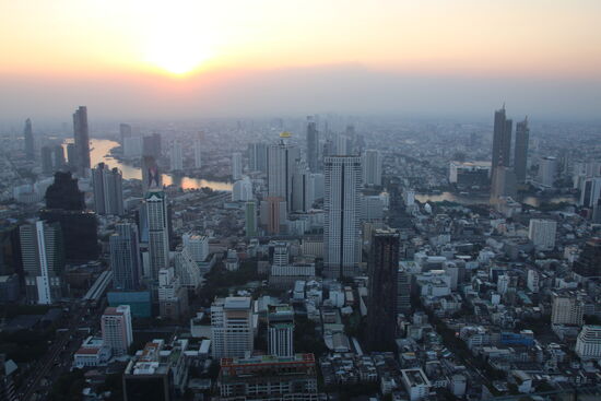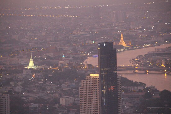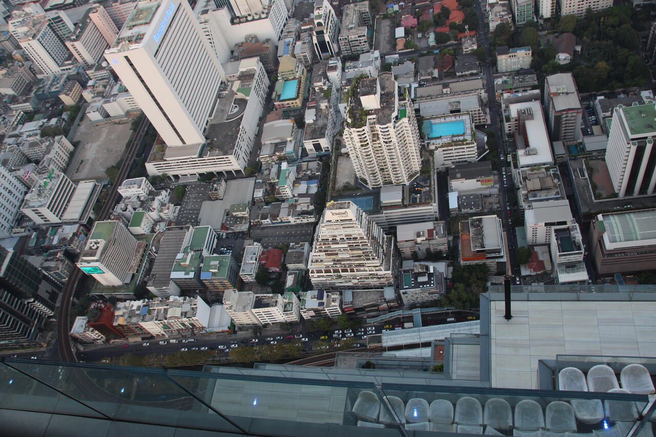 Kurz nach 17:00 mache ich mich auf den Weg. Ich möchte zum Sonnenuntergang dort sein. Erst mit der Sukhumvit Linie bis Siam, dann umsteigen in die Silom und bis xxxxxx fahren. Der Tower befindet sich erfreulicherweise direkt an der Haltstelle. Erst geht es mit dem Aufzug in den 74. Stock, dabei wird ein cooles Video laufen gelassene mit Flugaufnahmen durch Bangkok. Oben kann man die letzten 3 Stockwerke über eine Treppe oder einen offenen Aufzug hochfahren. Ich bin faul und nehme den Aufzug. Die Aussicht ist grandios. Und man kann noch ein paar Meter über eine Art Sitztreppe hoch. Hier gibt es auch keine Glasscheiben mehr die die Aussicht stören. Das besondere Highlight aber ist der Skywalk, eine Glasscheibe in 310 Metern Höhe, auf die man drauf kann. Man muss Stoffüberzieher über die Schuhe ziehen, die da Glas schützen und gleichzeitig gummiert sind, so dass man auf dem Glas nicht rutscht. Sehr praktisch. Der Blick nach unten ist genial.