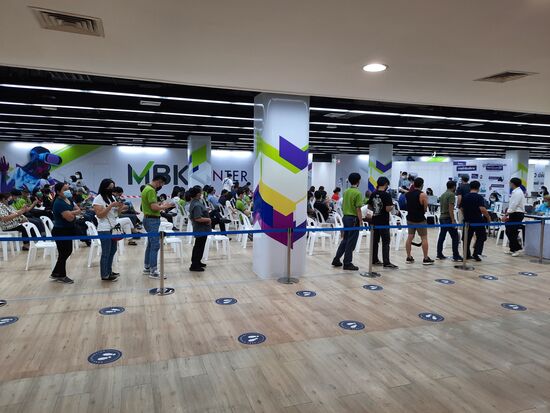 Auch am hinteren Ende der Mall sind in den unteren Stockwerken große Flächen abgesperrt. Hier sieht es aber eher so aus, als würde renoviert. Im 6. oder 7. Stock ist jetzt ein Impfzentrum eingerichtet, in dem zahlreiche Thais auf eine Impfung warten. Das Ganze läuft so generalstabsmäßig wie in unseren Impfzentren auch. Es würde mich interessieren wie viele Impfungen nur hier täglich durchgeführt werden. Wenn man den Andrang hier um die Mittagszeit sieht, werden die eher hohen Impfzahlen durchaus glaubwürdig.