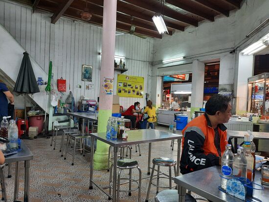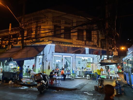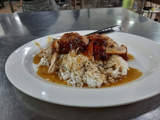 Ganz in der Nähe muss es eines das traditionsreichsten Lokal für Ente geben. Deshalb habe ich mir überlegt, das Abendessen mit dieser Besichtigung zu verbinden. Ich bin also geblieben bis es dunkel war, dann mit der Hochbahn drei Haltestellen weiter gefahren. Leider habe ich das Lokal nicht gefunden. Ente habe ich aber trotzdem gegessen. In einem typischen ganz einfachen offenen Ecklokal, wie es so viele in Thailand gibt. Ich habe Ente mit Reis und Soße gegessen, dazu ein Cola. Die Ente war lecker und saftig. Die Haut sehr schmackhaft mariniert und auch die Soße sehr lecker. Auch dieses Gericht war wieder nicht scharf. Die Portion war nicht allzu groß, hat aber gereicht. Das Ganze für 90 B.