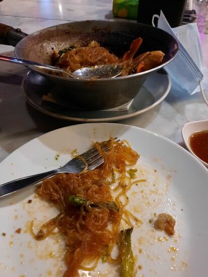 Ich habe erst Röllchen mit Schrimps und Wasserkastanie gefüllt gegessen und dann „Glasnudelpfännchen Der La Jazz“, also quasi nach Art des Hauses, was ja alles und nichts sein kann. Sie sind im Pfännchen serviert worden, mit etwas Grünzeug, leicht scharf, wobei die Schärfe wohl vor allem von einer der beigestellten Dips kommt mit Speckscheiben, kleine Wienerle und Shrimps drin. So hätte ich das nicht erwartet, aber es schmeckt gut.