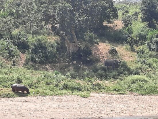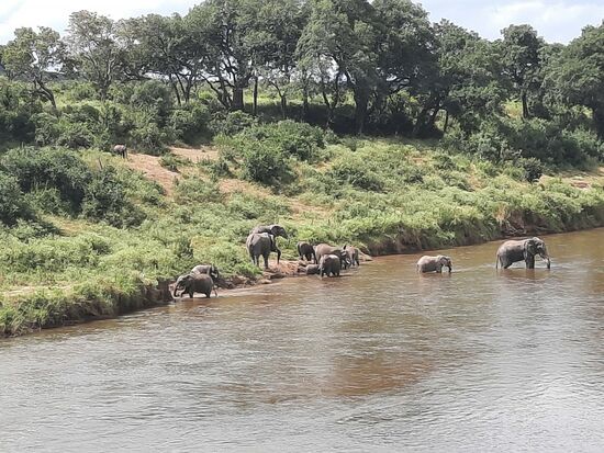 Schnell war die River House Lodge gefunden, wir waren sehr zeitig dran. Von außen nicht so Vertrauen erweckend…das Gebäude war wie ein Antik-Museum eingerichtet, wir tippten darauf dass es wenigsten schon 80-100 Jahre auf dem Buckel hat…weit gefehlt, es sind nur 25 Jahre. Im Inneren ein wundervolles Areal, direkt am Fluss gelegen mit einem wundervollen überdachten Deck mit vielen Sitzmöglichkeiten, wo man über den Fluss hinweg die Tiere im Krüger beobachten kann….ein Traum, uns begrüße ein Flusspferd und später eine Elefantenherde, die erst weidete und später im Fluss baden ging.
