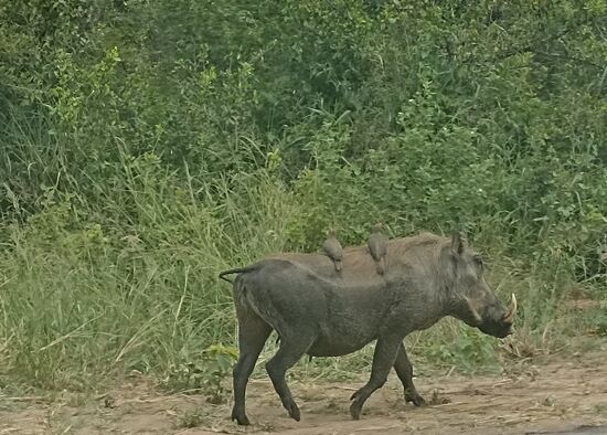Wir halten uns erst einmal Richtung Westen nach Berg en Dal. Auch die Sandpisten sind mit Normalo-PKW gut zu fahren. Zuerst begegnet uns ein Rudel Warzenschweine, eines mit zwei Mitläufern…