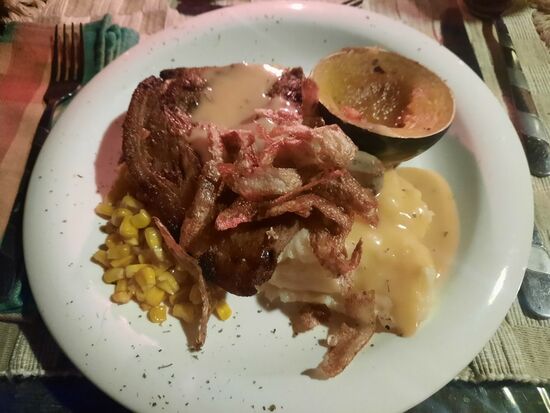 18.25 Uhr, wir sind am Gate…keine Löwen…das hatten wir anders erhofft…aber ok…es war trotzdem ein schöner Tag im Krüger. Noch tanken und ab ins Hotel…dort erwartet und wieder ein Überraschungsdinner. Der Hauptgang lamb chop mit Mais, James squash (einem Mini-Kürnis) und Kartoffelpü… superlecker. Da Essen ist wirklich toll in der River House Lodge.