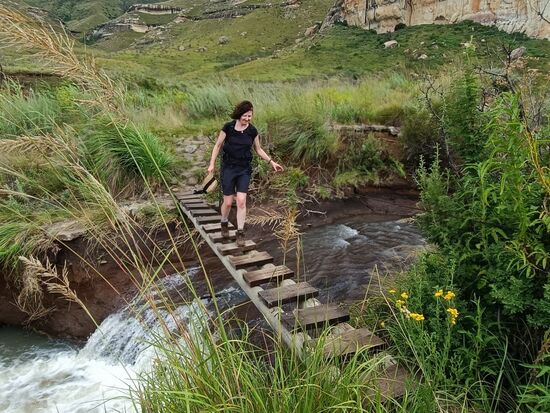 “…nun ja, beim nächsten Mal…wir laufen los, überqueren ein Fluss auf einer einfachen Bretter-Brücke…und 10 min später ….Donnergrollen und Blitze… wie jeden Tag in den Drakensbergen…ok. Wir sind nicht sehr mutig und machen kehrt.