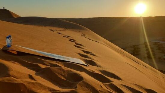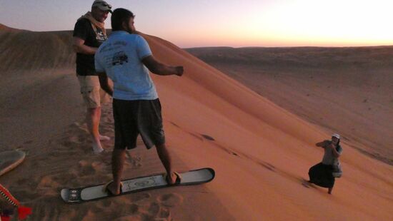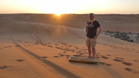 Ein paar Jungs wollen sich todesmutig mit Sandschlitten und Sandboard die Düne hinunter stürzen.