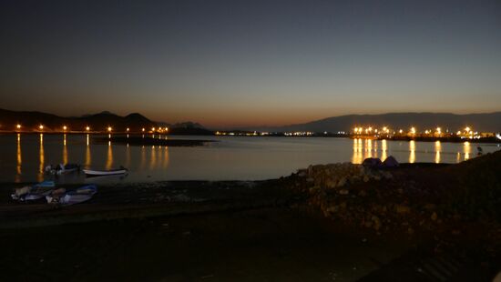 Auf diesem leider sehr unscharfen Bild kann man den Fang des Tages, bzw. Abends sehen. Der silbrige Haufen, der mühsam aus den Netzen gepult werden muß. Damit sind die Fischer sicherlich noch Stunden beschäftigt.