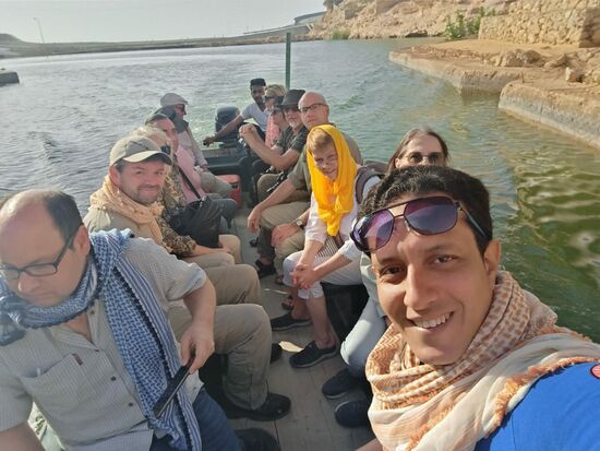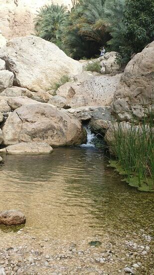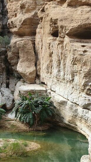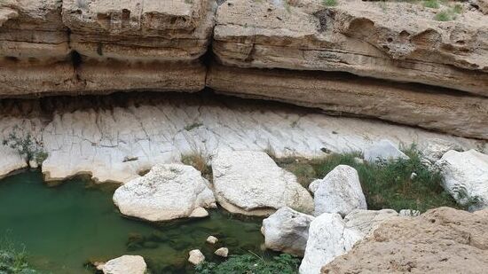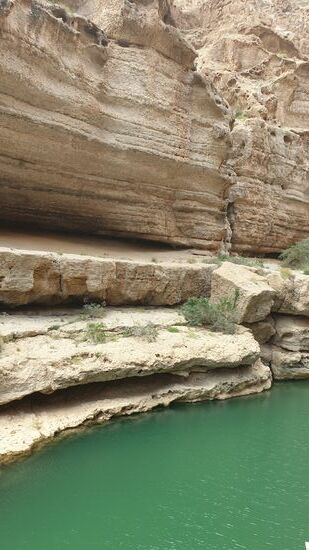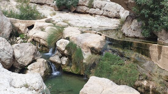 Aber vorher laufen wir noch einmal durch den Wadi. Shab. Dazu müssen wir in einem Boot übersetzen, um bis zum Wasser zu laufen.