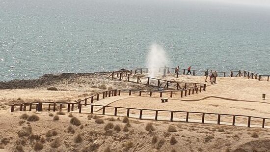 Wir spazieren auf einen Felsvorsprung, wo die starke Brandung im Laufe der Zeit das Gestein so erodiert hat, dass nun das Wasser in mehrere Meter hohen Wasserfontänen aus den Felslöchern, den sogenannten "Blow Holes" spritzt.