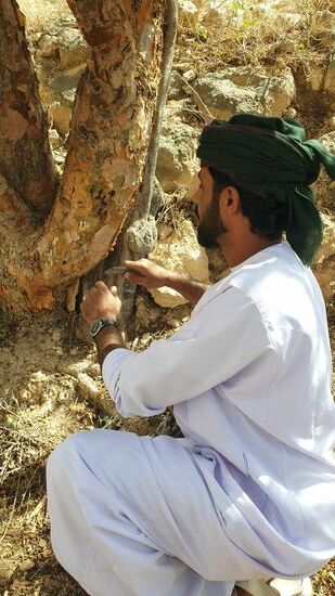 Mit einem Messer schabt er die Rinde ab, und es tritt weißer Saft aus. Nach ca. 1 Woche kann dann der Weihrauchharz abgebrochen werden. Eine ganz schön mühselige Arbeit.