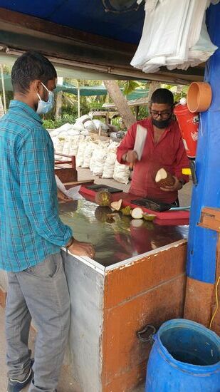 An einem der vielen Obststände halten wir an, um uns mit frisch aufgeschlagenen Kokosnüssen zu erfrischen