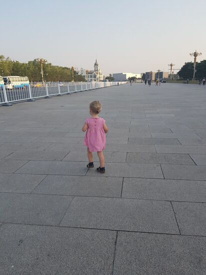 Im Park haben wir einen kurzen Blick auf den Stadtplan geworfen und uns gedacht, dass der Tian’anmen Platz, auch Platz des Himmlischen Friedens genannt, gar nicht so weit weg scheint und für uns neben der Verbotenen Stadt zu DEN Wahrzeichen Pekings gehört. Da unsere Tochter im Park in ihrem Buggy eingeschlafen ist, nutzten wir also die Gelegenheit und machten uns auf den Weg dorthin. Die Besichtigung der Verbotenen Stadt sollte zu einem späteren Zeitpunkt folgen, wenn wir am Ende unserer Reise wieder in Peking ankamen. Auch wenn die Entfernung auf der Karte relativ gering aussah, zog sich der Weg doch etwas. Da wäre vielleicht auch ein Taxi gut gewesen, aber für uns brachte es die ersten Eindrücke in den Alltag der Pekinger und wir erspähten links und rechts der Straße das ein oder andere traditionelle Gebäude.