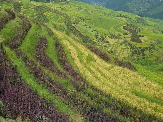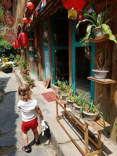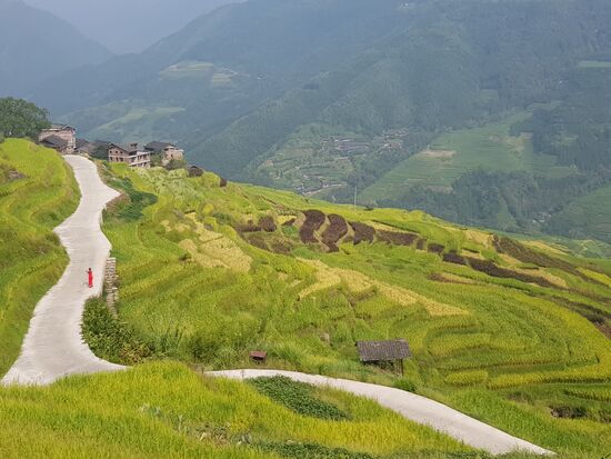 Kurz haben wir uns gefragt, wo mit einmal all die Busladungen an Touristen hin sind, aber an diesem Aussichtspunkt waren wir nur unter einigen wenigen, die von dort kleine individuelle Wanderungen durch die Terrassen starteten. Hier hatten wir erst einmal ein bisschen Zeit, den Ausblick zu genießen. Vor uns lagen zwei vereinzelte Dörfchen in der Landschaft und wir konnten ein paar Fotos machen. Dann ging es direkt los. Mit unserer kleinen Gruppe und der Reiseleiterin vornweg sind wir durch die Terrassen geschlendert. Unsere Tochter haben wir ein bisschen getragen, viel ist sie aber auch selbst gelaufen, da die Wege, wie immer in China, sehr gut aufbereitet waren.