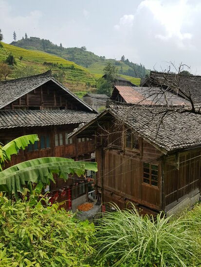Diesen Tagesausflug hatten wir auch schon von Zuhause aus gebucht. Auch hier haben wir ein bisschen im Internet recherchiert und dann einen sehr gut bewerteten Anbieter für diese Ausflüge über Tripadvisor gefunden. Da unsere Reiseroute in den Tagen nicht allzu flexibel war, konnten wir den Tagesausflug eigentlich nur an diesem Dienstag wahrnehmen. Das war ein bisschen Glück, da dieser auch nicht jeden Tag angeboten wurde (ich glaube nur an drei Tagen die Woche). Wir wurden recht früh direkt von unserem Hotel abgeholt. Unsere kleine Reisegruppe bestand aus dem Fahrer des Kleinbusses, der englischsprachigen Reiseleiterin, zwei bulgarischen Touristinnen und uns Dreien. Man glaubt es kaum, aber dies war das einzige Mal, an dem es für unsere Tochter einen Kindersitz im Auto gab!! Gute 2 Stunden fuhren wir zu den Longji Reisterrassen. Schon die Fahrt dorthin ist wunderschön. Irgendwann ging es mit dem Bus in die Berge, vorbei an kleinen Dörfern, mit typisch traditionellen Holzhäusern und kleinen Bächen, in denen von der einheimischen Bevölkerung verschiedene Dinge gewaschen wurden, immer weiter bergauf zu einer zentralen Bus- und Touristensammelstation, sozusagen das Eingangstor zu den Reisterrassen. Dort kaufte unsere Reiseleiterin schnell die Tickets und wir hatten dort die Möglichkeit, eine Toilette zu benutzen. Dann ging es mit dem Kleinbus noch etwas weiter zu einer Station, wo wir auf eine Art Golfmobil umsteigen mussten und noch einmal etwas höher in die Berge fuhren. Oben angekommen, eröffnete sich uns ein atemberaubendes Panorama über die Reisterrassen.